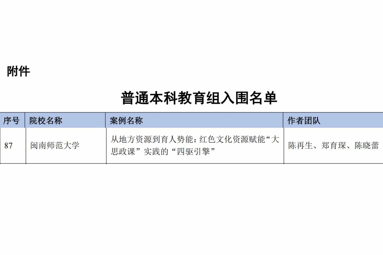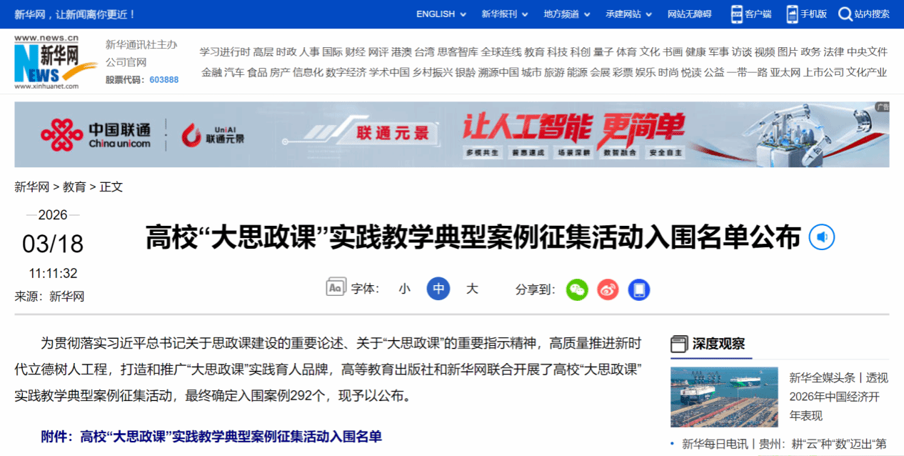 近日,由高等教育出版社与新华网联合开展的高校“大思政课”实践教学典型案例征集活动结果正式发布。该活动于2025年9月启动,旨在深入贯彻落实习近平总书记关于思政课建设的重要论述,高质量推进新时代立德树人工程,打造和推广“大思政课”实践育人品牌。据悉,此次活动共收到来自全国数百所高校的千余个实践教学案例,经过专家团队多轮严格评审,最终确定入围案例292个。太阳成集团tyc41183陈再生、郑育琛、陈晓蕾团队申报的《从地方资源到育人势能:红色文化资源赋能“大思政课”实践的“四驱引擎”》案例成功入选。