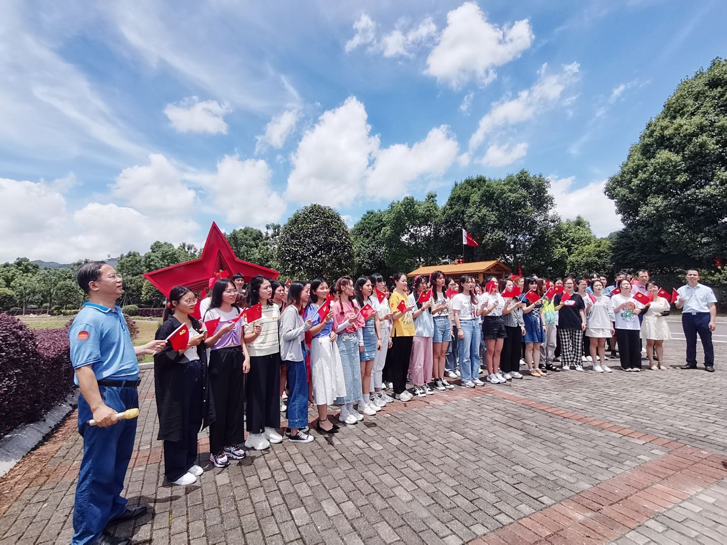 5月23日上午,师生一行先后参观了古田会议会址和古田会议纪念馆。在讲解员的引导下,师生们结合会址实景和一幅幅历史照片认真聆听讲解,凝望着廊柱上富有鲜明战斗性的标语,注视着当年会议代表取暖留下的斑斑炭火印迹,共同追忆先辈们探寻革命道路时艰辛奋斗的历史情景。在古田会议纪念馆,师生们观看闽西革命历史文字照片和实物资料,更加直观地了解了中国共产党创立到成长过程中的艰辛历程,感受到了老一辈革命家筚路蓝缕的峥嵘岁月。参观结束后,10多名党员齐聚一起,李定庆书记颁发政治生日贺卡,为5名党员集体过“政治生日”,上了一堂直抵人心的“情境党课”。 随后,全体师生集体传唱红色经典,共抒爱国爱党情怀。