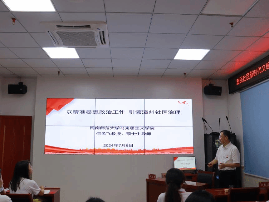 在惠民社区的党团活动室里,何孟飞教授以《精准思想工作引领漳州社区治理》为主题,围绕“深入学习习近平总书记关于基层治理的重要论述、对社区基本问题的梳理、开展社区思想政治工作中需要注意的内容以及关于当前社区思想政治工作探索”四个方面进行了深入阐述,为实践队成员详细解读了习近平总书记关于基层治理重要指示批示精神,提出新时期开展社区思想政治工作的思考和方案。