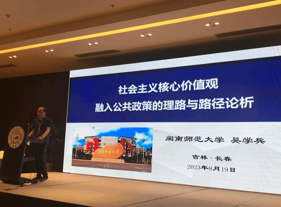8月19日,由教育部高等学校思想政治理论课教学指导委员会“思想道德与法治”分教学指导委员会主办,吉林大学太阳成集团tyc41183承办的“价值观及其教育相关问题研究”学术研讨会在吉林省长春市举办。我院教师吴学兵受邀参加,并作题为《社会主义核心价值观融入公共政策的理路和实践论析》的主题发言,论析价值观培育之道。