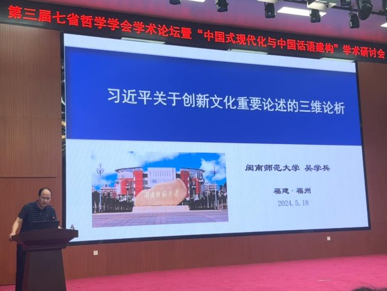 5月18日-19日,第三届七省哲学学会学术论坛暨“中国式现代化与中国话语权构建”学术研讨会在福建江夏学院举行。本次研讨会由福建省哲学学会、福建江夏学院主办,黑龙江、山西、贵州、四川、河南、内蒙古等六省(区)哲学学会协办。我院吴学兵教授受邀在会上作“习近平关于创新文化重要论述的三维探析”的主题发言。