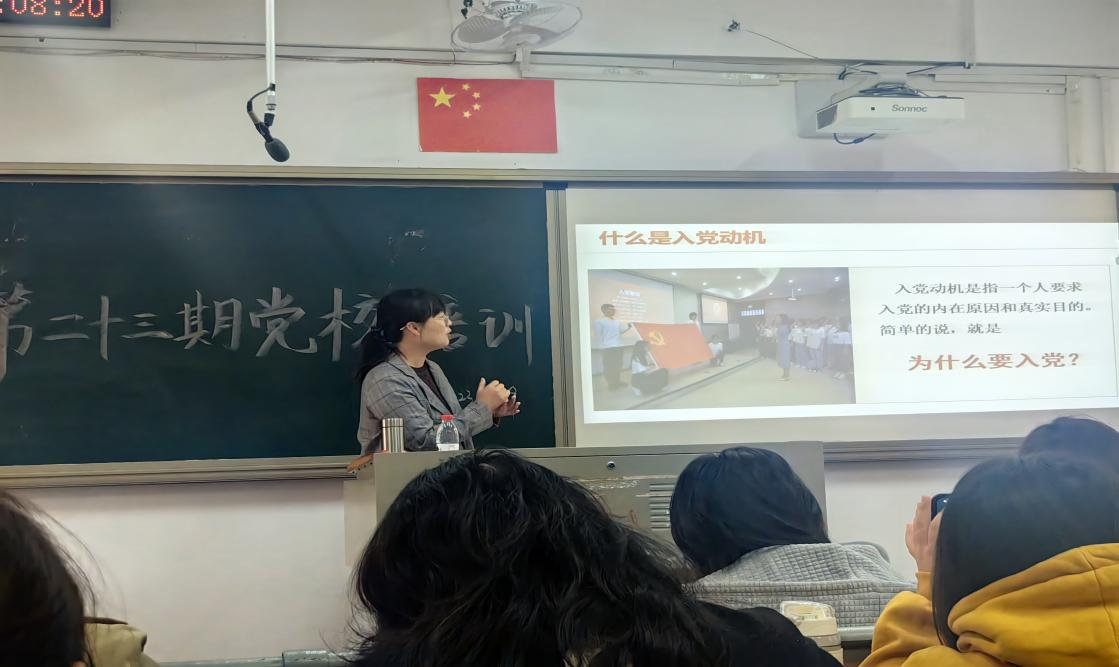 首先,陈晓蕾老师结合习近平总书记在《求是》上发表的题为《扎实做好保持党的纯洁性各项工作》的署名文章引入,她从“产生正确的入党行动”“成为合格党员”“经受住问题和考验”“接受党组织的考验””等四个方面对端正入党动机的重要性展开讲解。她还结合自己的入党故事,在课堂上展示了老一代共产党员回忆入党初心的采访视频。陈晓蕾老师还建议同学们多阅读马列主义经典著作,深入学习马克思主义中国化的最新理论成果,从中汲取智慧和养分,进一步端正自身入党动机。最后,她强调青年大学生们要坚决抵制虚荣被动型、从众投机型、功利实用型和情绪型等错误入党动机的侵蚀。要坚定理想信念,努力把正确的入党动机转化为行动,在实践中不断提高自身的党性修养。