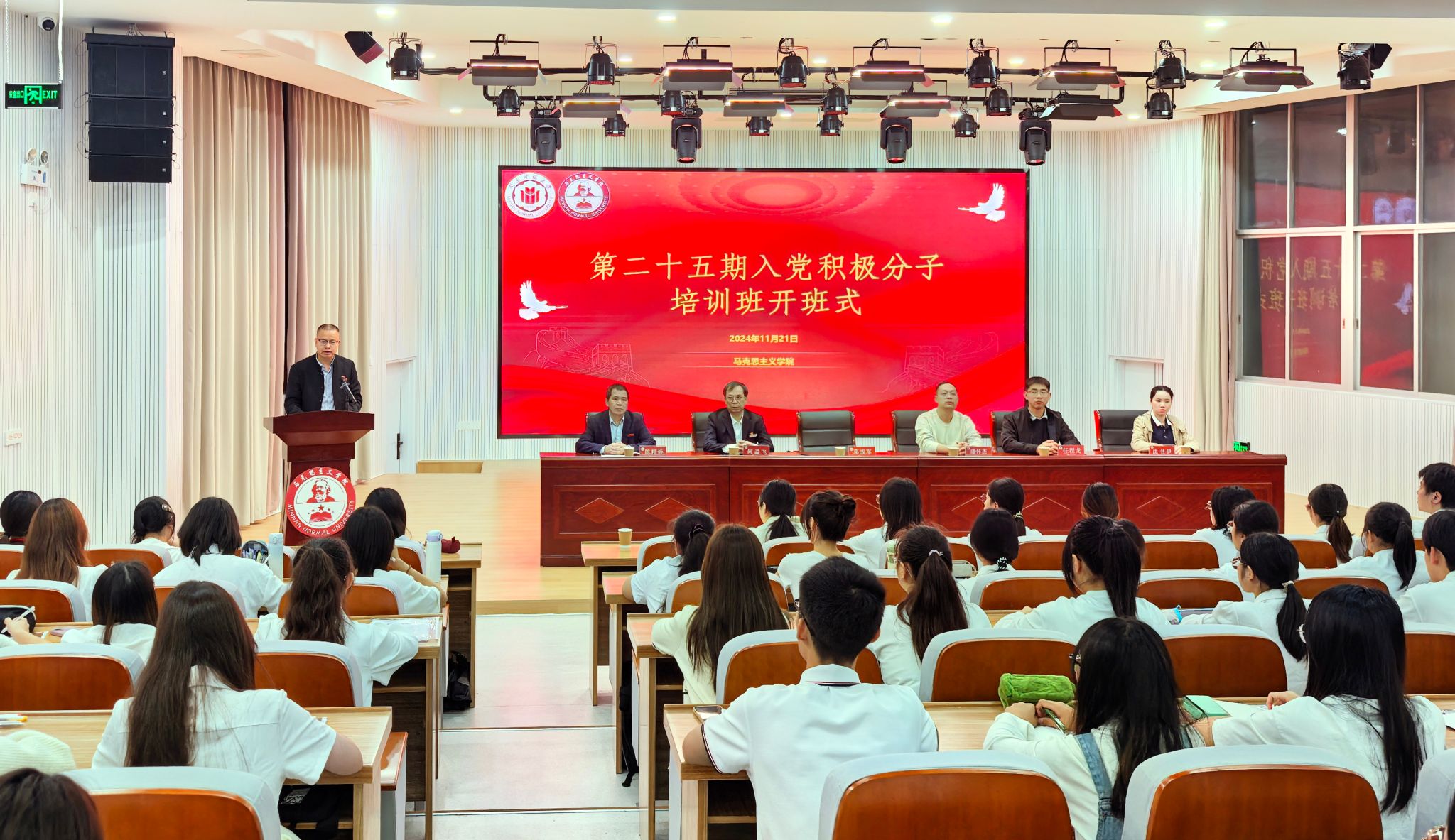 11月22日,我院分党校第二十五期入党积极分子培训班开班式暨第一讲在学院礼堂举行。院党委副书记邓战军、党委委员何孟飞、党委组织员陈精焕、全体辅导员及全体学员参加开班式。开班式由陈精焕主持。