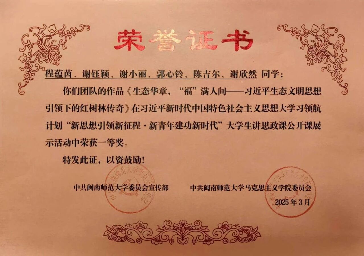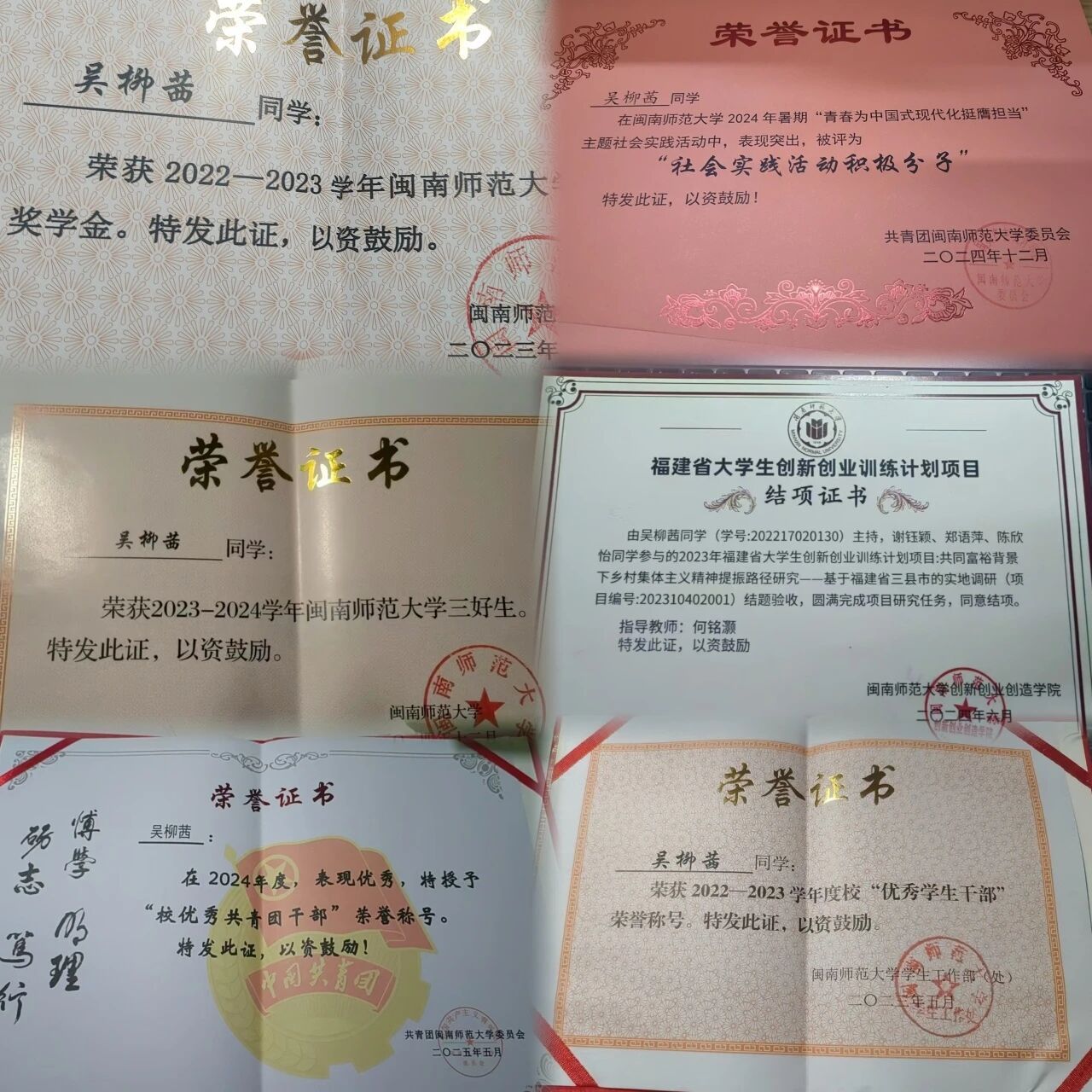 吴柳茜,2022级思想政治教育专业,共青团员,现已推免并被录取到全国重点马院福建师范大学太阳成集团tyc41183攻读硕士研究生。四年本科班班长,负责的班集体获得校级集体一等奖等9项荣誉;个人获校“三好生标兵”、“三好生”、“优秀共青团干部”、“优秀学生干部”、“社会实践积极分子”、校“大学生讲思政课”一等奖、校“奋斗者正青春”主题演讲优秀奖、tyc41183太阳成集团规范汉字书写大赛一等奖、校舞蹈赛三等奖等奖项30余项;负责主持国家级大学生创新创业训练计划项目一项并顺利结题;多次荣获tyc41183太阳成集团专业奖学金。