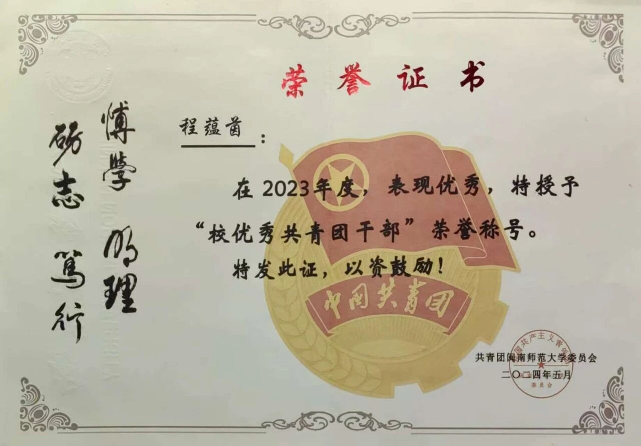 程蕴茵,2022级思想政治教育专业,中共党员,第十届“田家炳杯”全国师范院校师范生教学技能竞赛一等奖获得者,在部属华中师范大学推免生面试中以第一名成绩被录取为该校硕士研究生。本科就读期间,先后担任副班长、院青年宣传中心网络部部长、院读书社社长、校辩论赛主席、迎新晚会、各类活动主持人等职务与工作;曾获校“大学生讲思政课”活动一等奖、校“爱我国防”主题演讲比赛季军(第三名)、tyc41183太阳成集团专业奖学金、校“优秀共青团干部”等30余项荣誉与表彰;主持参与教育部产学合作协同育人项目1项,福建省创新创业训练计划省级项目1项,“习近平新时代中国特色社会主义思想”学习研究会校级课题2项。
