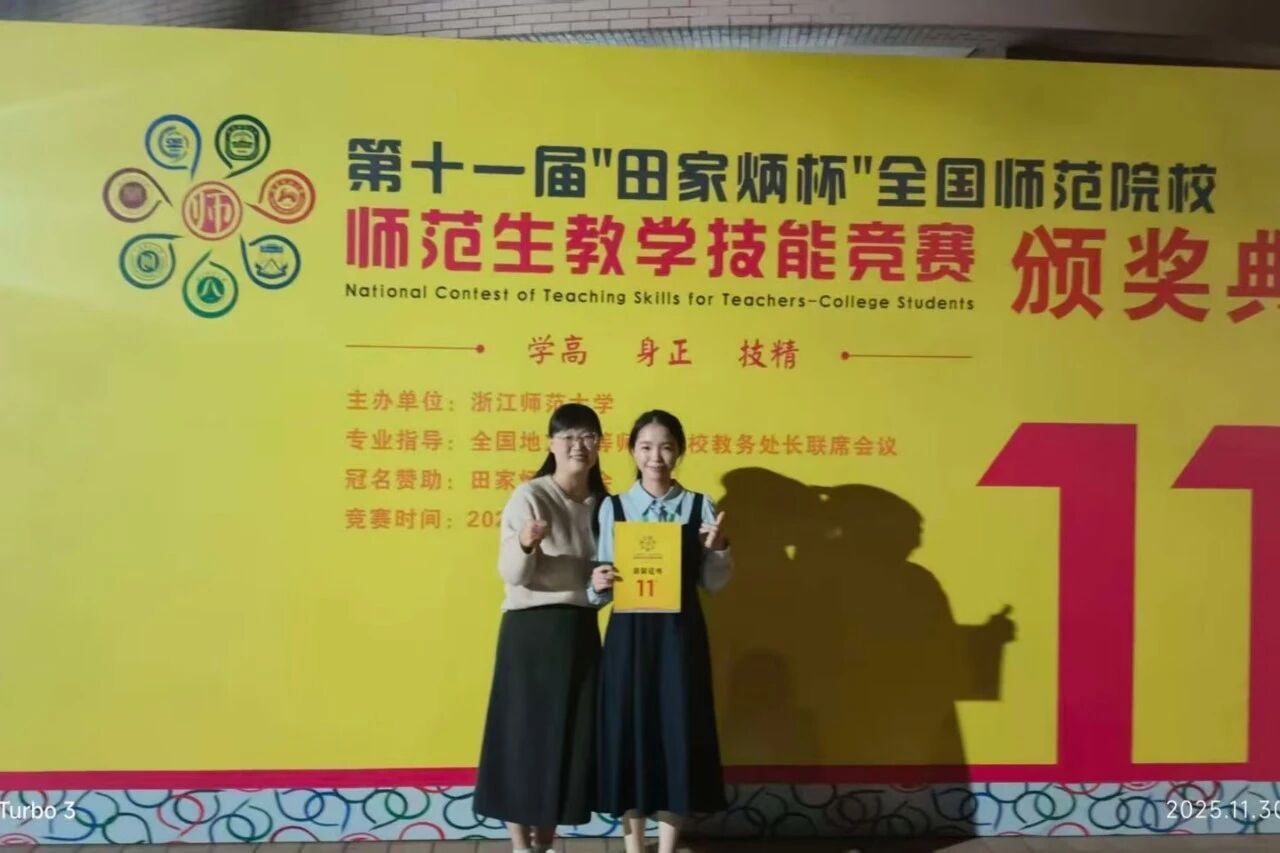 近日,第十一届“田家炳杯”全国师范院校师范生教学技能竞赛在浙江师范大学举行。在思想政治教育组比赛中,由我院“三人行”师生成长工作室教师团队共同指导的2023级思政一班学生白欣琳,凭借扎实的教学功底与出色的现场表现,荣获全国二等奖。