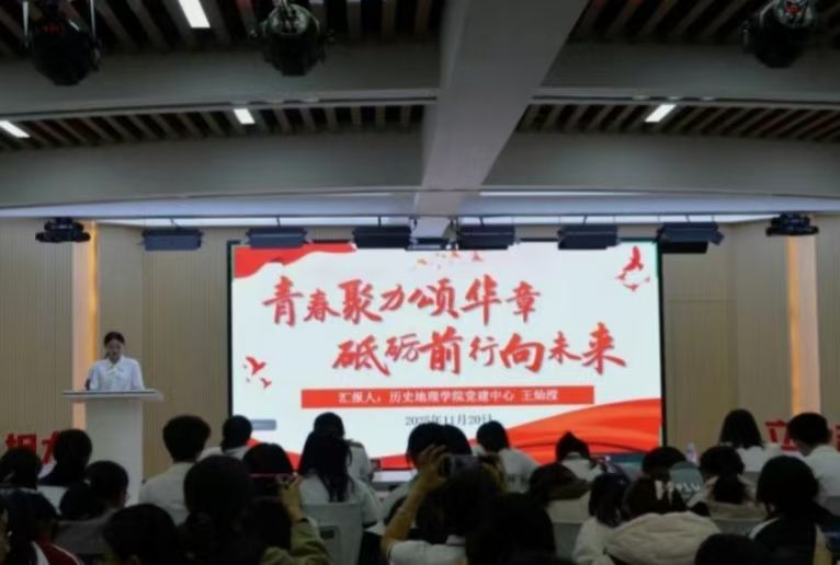 随后,历史地理学院党委副书记邱文芳发表致辞,她从坚定理想信念,提升个人素质,勇担时代使命三个方面对学员提出希望,引导学员筑牢信仰根基,练就过硬本领,矢志艰苦奋斗,激发学员们将青春热情转化为强国建设的实干担当。