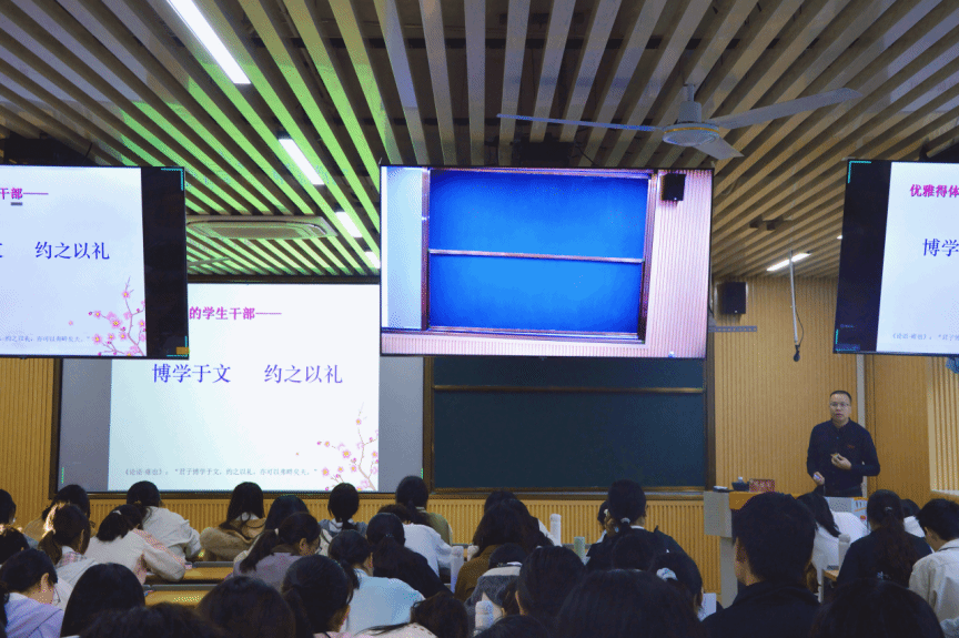 11月22日下午,太阳成集团tyc41183党委副书记邓战军老师聚焦“学生干部礼仪素养”主题,开篇明义地鼓励学员们勇于沟通,不断提升人际沟通能力;通过启发式引导,锤炼学员思辨能力;同时提醒大家“博学于文”,在工作与生活中“约之以礼”,律己敬人。以“对人敬一点、仪容净一点、穿干练一点、语言甜一点、微笑多一点、眼神正一点、仪态雅一点”的总结,勉励全体学员做优雅得体的闽师学子。