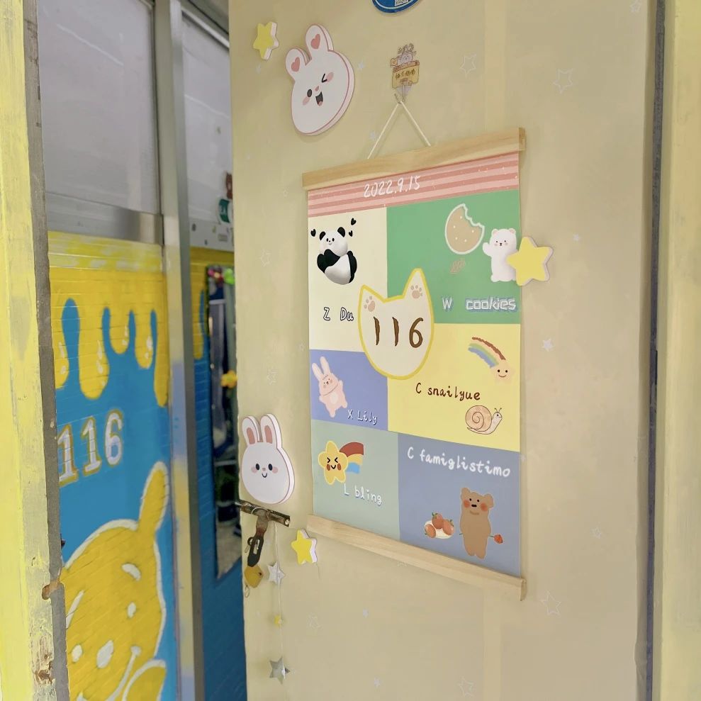 116宿舍以“且以浩瀚星辰,与世界同频呼吸”为主题,走进116快乐星球的“门”上,有一幅挂幅,共6部分,每部分代表着116星球的不同居民,周围的星星彩虹,也为友谊点缀。