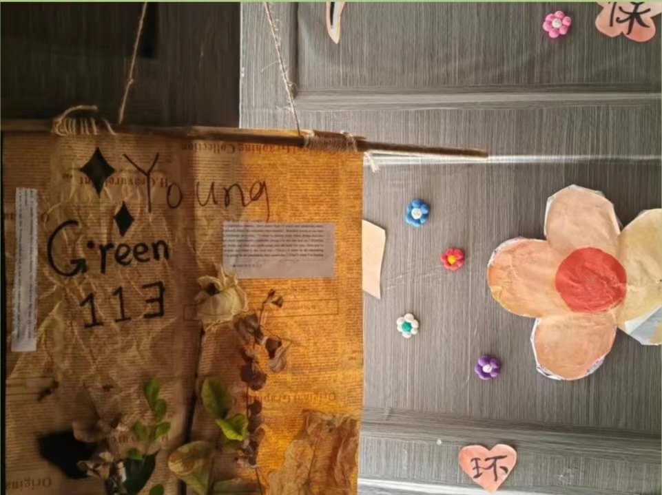 309宿舍装扮的理念是绿色、环保、温馨。宿舍成员在原有的基础上增添了许多小细节来点缀,如门口用黏土制作的门牌,随处可见的环保标语,手工折纸折叠的千纸鹤等。宿舍装扮贯彻了“变废为宝”的绿色理念,利用各种废弃材料,一次性筷子、矿泉水瓶、树叶、木棍等制作了许多精美的小摆件。从整体风格中可以感受到宿舍成员蓬勃向上的活力,营造了一个温馨和谐的寝室环境,在美丽干净的宿舍中宿舍成员们也争做绿色低碳生活方式的践行者,契而不舍、驰而不息,让世界天更蓝、山更绿、水更清、生态环境更美好!