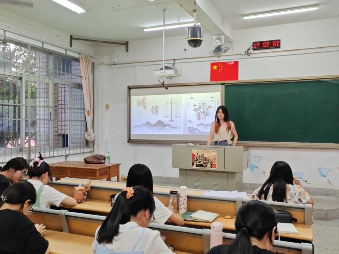在本次主题班会上,各班班长向同学们科普了诈骗的几种基本形式,用日常生活中的现实例子来展现反诈中容易遇到的陷阱,生动易懂地宣传了反诈知识,使反诈观念真正地入脑、入心。除此之外,本次班会提倡“诚信做人,树立文明新风”,引导同学们在日常生活中讲诚信、遵美德,旨在提高大学生的个人修养,携手共建诚信社会。
