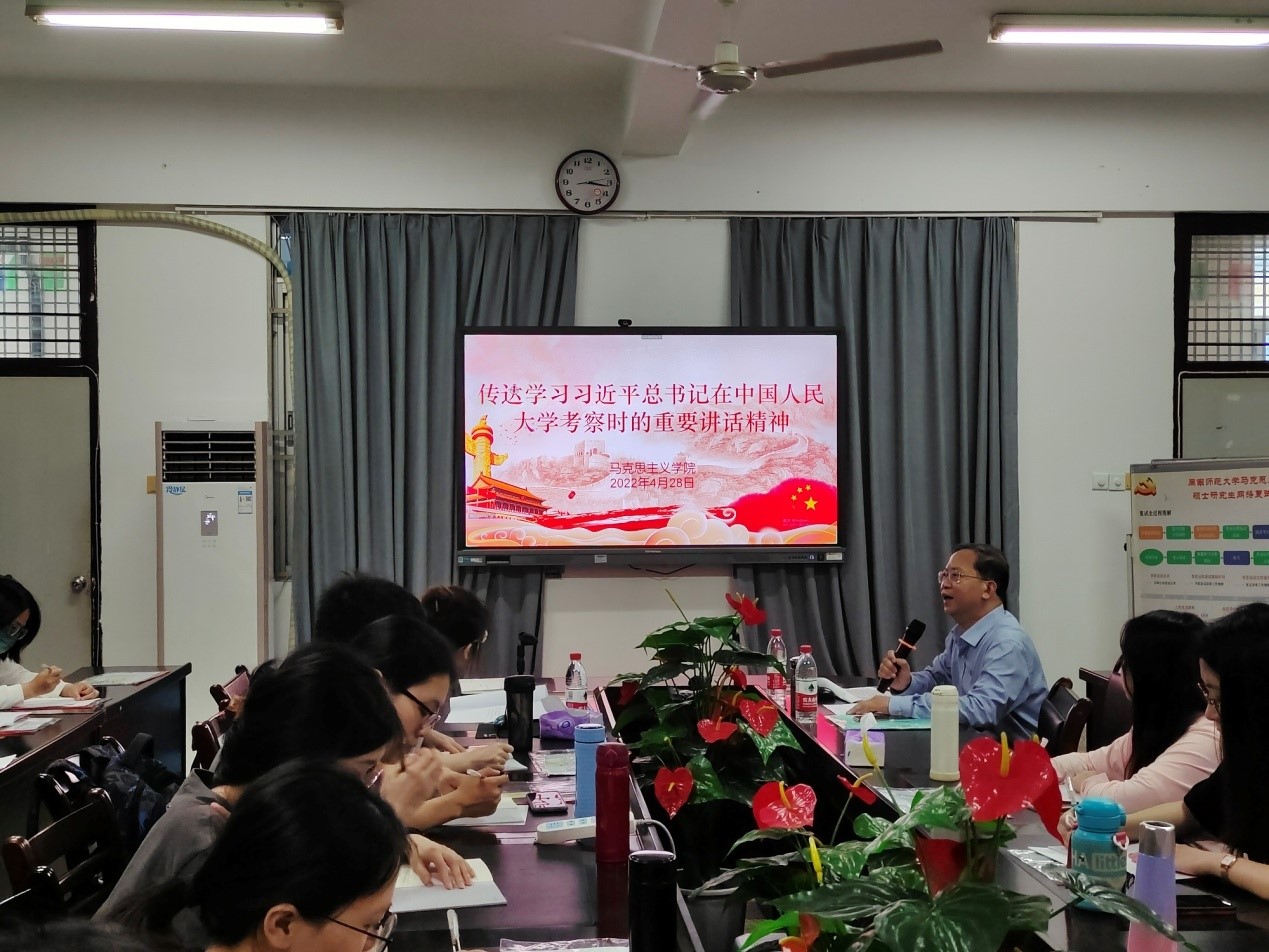 4月28日上午,太阳成集团tyc41183党委召开专题会议,传达学习习近平总书记在中国人民大学考察时的重要讲话精神,研究部署贯彻落实举措,院党委书记李定庆就组织全院师生开展学习总书记重要讲话精神进行了部署,他从党建、教学、团学工作等几个方面进行了布置,并提出了具体工作要求,院党委委员和各科室负责人参加了会议。