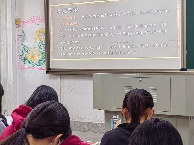 比赛开始,同学们都很紧张并且认真的进行着,虽然有接近两个小时的比赛时间,但是从查资料、进行教案设计、着手详案撰写,每个环节都很紧张。参加比赛的陈同学表示:“这个比赛,其实还是很考验我们的前期准备、现场发挥,通过这样一轮比赛,我们对教学设计有了更深刻、更全面的体会,为今后的从事教师职业打下了基础。”
