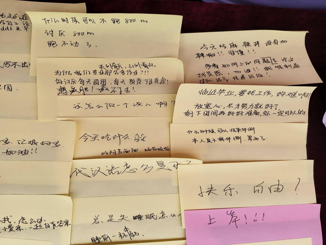 五月上旬,我院自律委员会心理协会在tyc41183太阳成集团弦歌广场上举行“心灵树洞”活动。活动现场,同学们在便利贴上写下自己的心理烦恼和困惑,同时解答他人的心理困惑。此次活动为学生们提供了一个释放心理压力的平台,鼓励了学生积极面对生活。