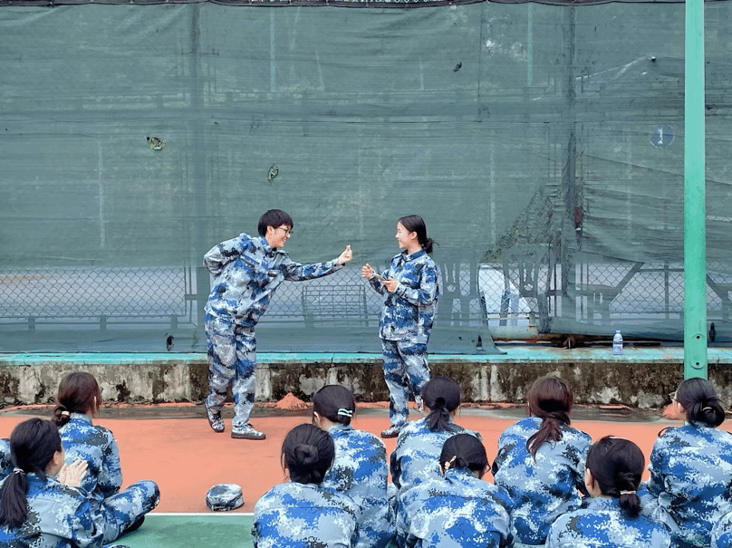教官们身着迷彩绿、悉心教导;