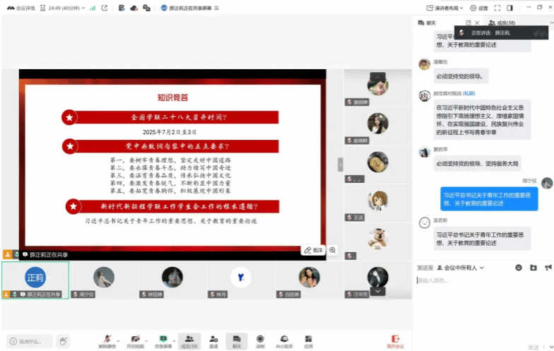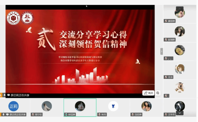 会上,各班级、各组织学生骨干围绕习近平总书记重要贺信精神和党中央致词精神进行领学,通过主题宣讲、知识问答、交流研讨等多元方式,深化同学们对会议精神的领悟。大家深刻认识到,青年和青年学生肩负着光荣的使命,纷纷表示将锤炼过硬本领,坚定理想信念,为强国建设、民族复兴伟业贡献青春力量。