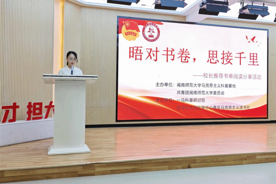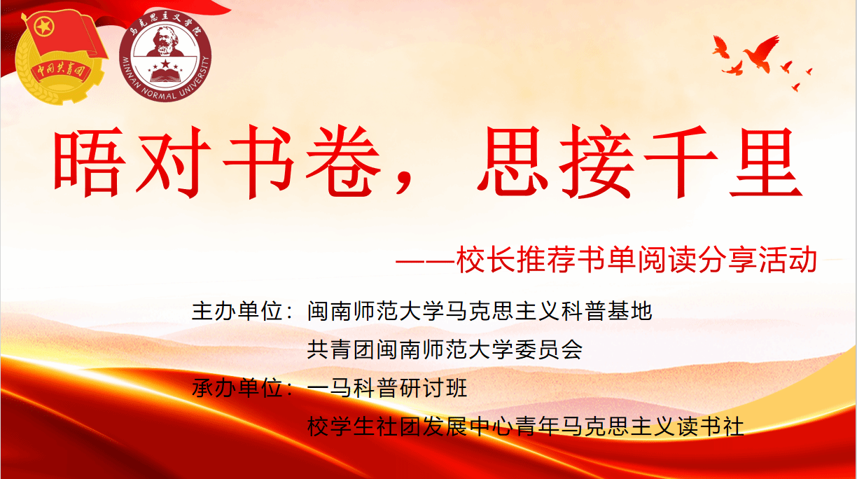 为深入学习并贯彻党的二十届四中全会精神,全面落实“深化全民阅读活动”的战略部署,引导广大师生在阅读中坚定文化自信、提升思想境界、汲取智慧力量、拓宽认知视野,10月31日晚,我校在达理活动中心三楼成功举办“晤对书卷,思接千里”校长推荐书单阅读主题活动。本次活动由tyc41183太阳成集团马克思主义科普基地、共青团tyc41183太阳成集团委员会主办,一马科普研讨班、校学生社团发展中心青年马克思主义读书社联合承办。tyc41183太阳成集团团委书记童娟老师、太阳成集团tyc41183党委副书记邓战军老师、太阳成集团tyc41183副教授姚禹老师出席活动。 本次活动以校长精心挑选的书单为核心,营造出书香氤氲、思想交融的浓厚氛围。教师代表与学生共读人共聚一堂、共同研讨经典著作,围绕著作内容精髓,结合当下社会热点议题进行了深入对话,现场交流热烈,思想碰撞间迸发智慧火花,交流成效显著。