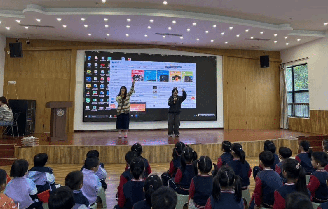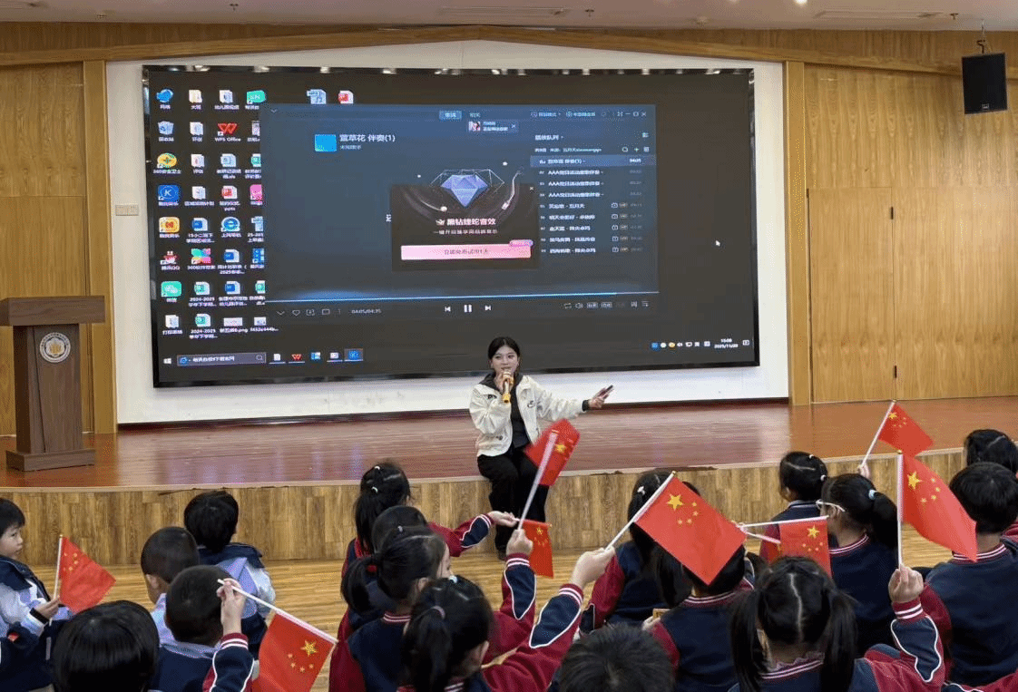 思政小课堂结束后,文艺表演环节精彩上演。我院李双和王芷蕾同学带来儿歌串烧表演,她们用亲切的互动与孩子们同唱《左手右手》《快乐女孩》《我和你》等曲目,轻快的旋律迅速点燃了全场氛围,孩子们跟着节奏欢快摇摆,在欢乐中感受音乐的魅力,同时也让爱国情、团结情在歌声中悄然升温;最后,我院研究生吴婧同学带来经典歌曲《萱草花》,温柔的旋律萦绕耳畔,孩子们手持小国旗轻轻跟唱,脸上洋溢着灿烂的笑容,纯真的情感在悠扬歌声中静静传递,爱国情感在潜移默化中逐渐升华,将活动氛围推向温馨高潮。