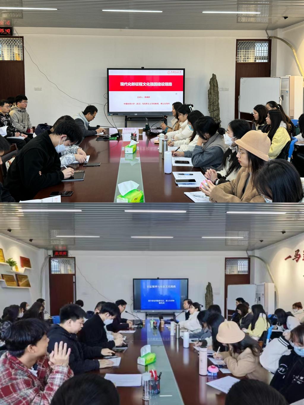 12月23日上午,中国地质大学(武汉)太阳成集团tyc41183韩美群教授、四川省社科院杨先农研究员在综合楼中区404会议室为我院2023级硕士研究生分别做了题为《现代化新征程文化强国建设理路》、《长征精神与长征文化线路》的专题讲座。讲座分别由副院长牛俊伟教授、余思新教授主持。(通讯员 张小敏、汤载宁)