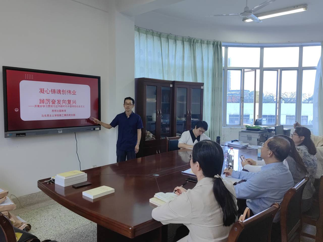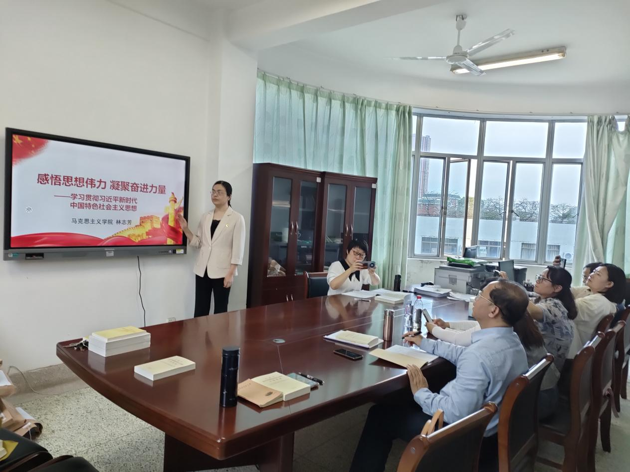 林志芳同志结合《习近平新时代中国特色社会主义思想概论》课教学工作实际,作了《感悟思想伟力凝聚奋进力量》学习汇报,从全面把握教学体系、精准阐述教学内容、灵活运用教学方法等方面,分享了如何将主题教育成果更好融入教学工作的思考。