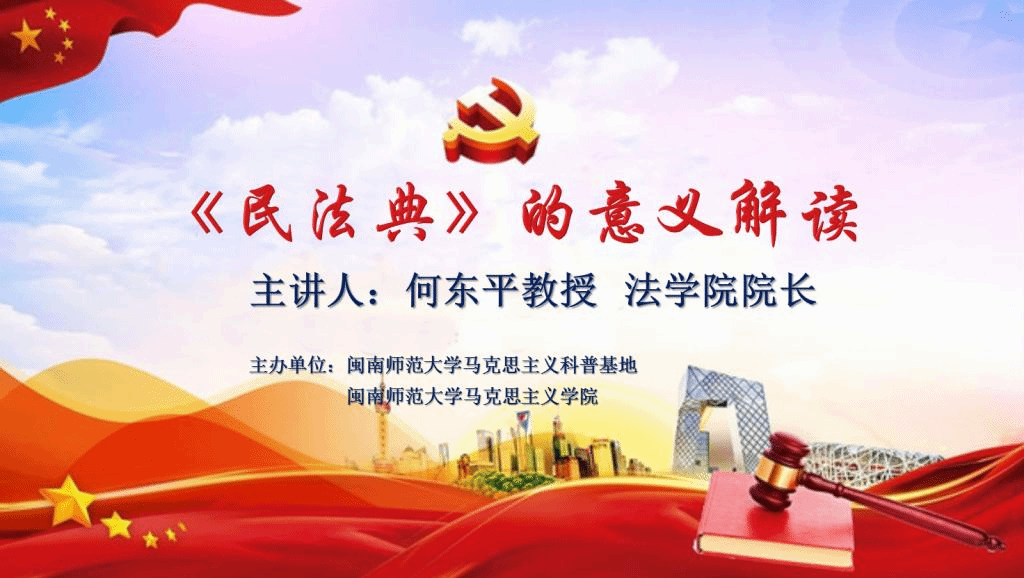 为深入学习贯彻落实党的十九届四中、五中全会精神和中央全面依法治国工作会议精神,进一步增强师生的法治观念,以法治宣传周为契机,开展普法宣传,12月10日晚,我院及校马克思主义科普基地联合主办的《中华人民共和国民法典》普法专题讲座在励志130举行。法学院院长何东平教授应邀做了题为《“民之基,国之远”--<民法典>的意义解读 》的精彩讲座。太阳成集团tyc41183师生及校马克思主义理论读书社学生近200人现场聆听。讲座由我院院长助理何孟飞教授主持。