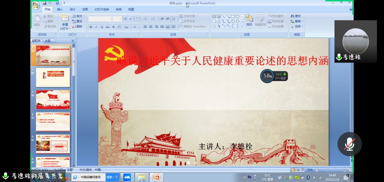5月16日下午,我院于腾讯会议开展分党校第十六期入党积极分子第六讲培训,本讲培训以“习近平关于人民健康的重要论述”为主题,由李德栓教授主讲,全体入党积极分子积极参与。