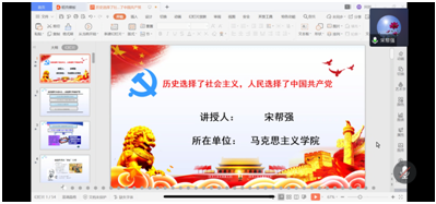 5月10日下午,我院分党校第十六期入党积极分子培训班通过腾讯会议开展第四讲学习。本次“历史选择了社会主义,人民选择了中国共产党”专题培训,由副院长宋帮强副教授主讲,全体入党积极分子参与。