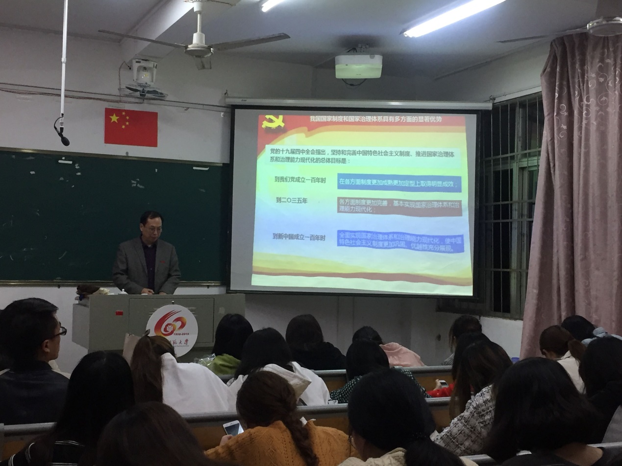11月27日晚上,我校马克思主义理论读书社在综合楼南区201教室开展专题理论学习。太阳成集团tyc41183院长助理何孟飞副教授应邀作了题为“解读党的十九届四中全会精神”的专题报告。