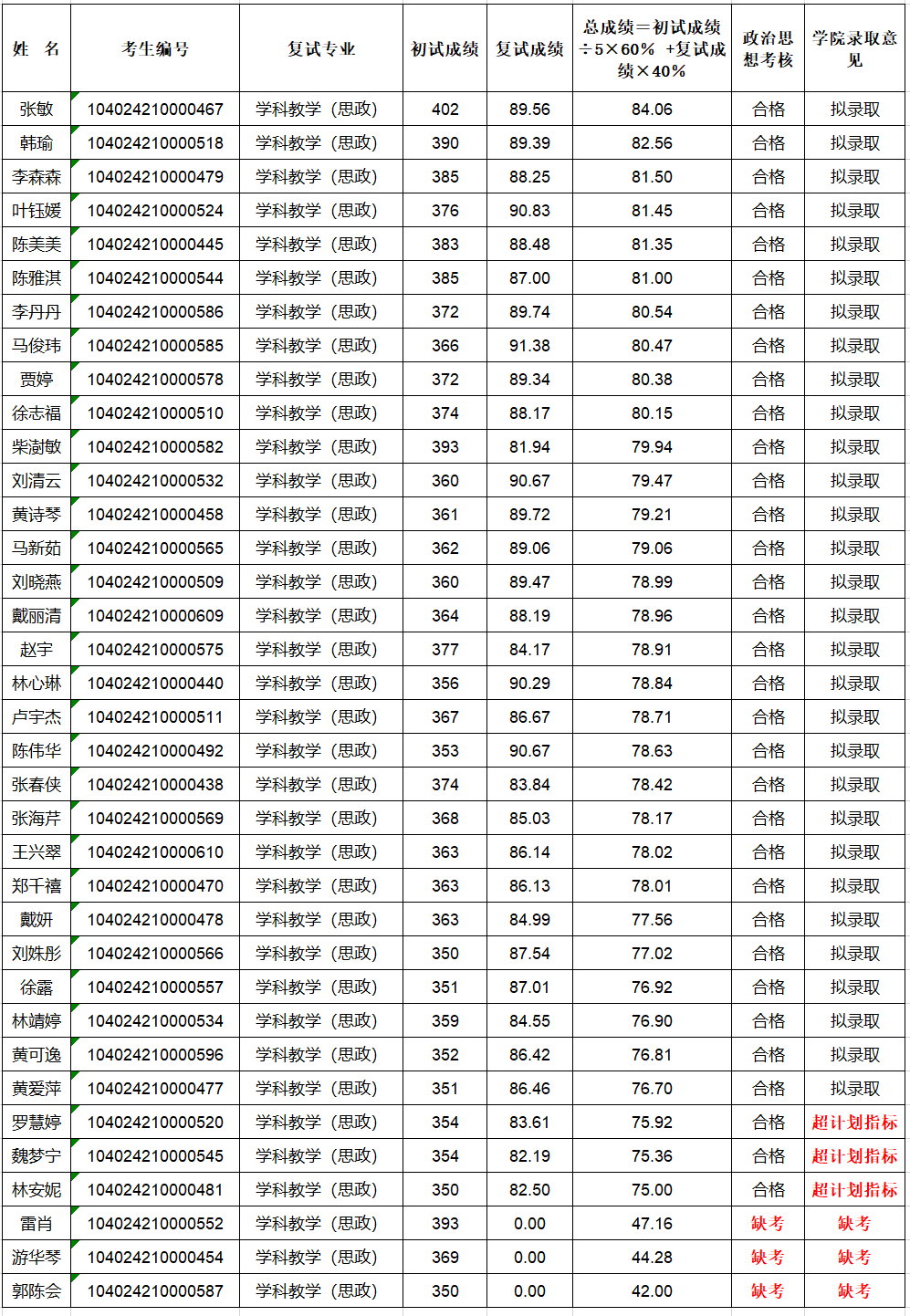 太阳成集团tyc411832024年一志愿复试结果及拟录取情况公示(学科教学(思政)专业)