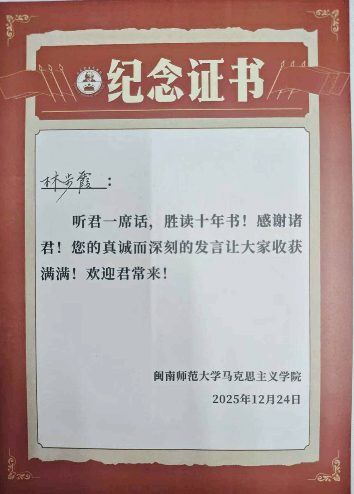 最后,两位老师给积极发言的同学颁发活动纪念证书,希望参加活动的师生真诚而深刻的发言能让大家有“听君一席话,胜读十年书”的收获感;希望同学们有“家事国事天下事事事关心”的家国情怀,践行大学之“大”在于探讨“大问题”“大事情”的大学之道。