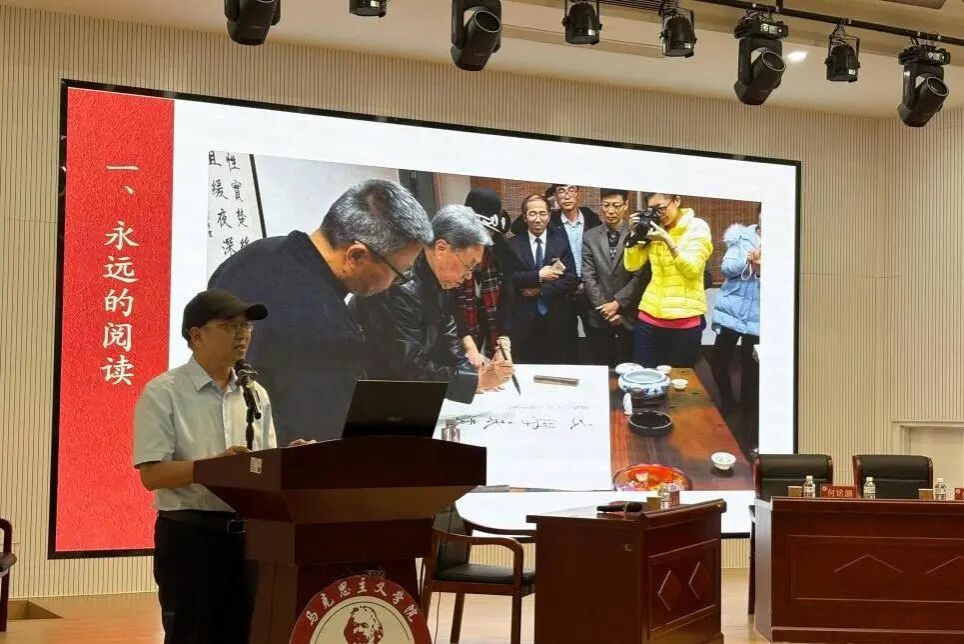 黄金明教授以“永远的阅读”为切入点展开了主题分享。他指出,尽管传媒形态的变迁深刻改变了文化学习、生产与传播的方式,但阅读的根本价值从未褪色。他援引梁启超的观点,强调在校园时期养成读书习惯,将为未来人生奠定坚实的精神基础。在“读书与成人”板块中,黄教授贯通古今,从孔子的诗教观、刘勰的为学之道,到韩愈的修养论,再结合周国平的现代阐释,系统阐述了读书对人格塑造与精神觉醒的重要意义。谈及“读书与世界”,他引用林语堂“寻找灵魂共鸣的作家”与叔本华“内心丰富见世界丰富”的观点,指出阅读是突破个体生命局限、拓展认知边界的桥梁;并以约翰·卢伯克“书籍是人类记忆的容器”为喻,强调书籍在文明传承中不可替代的核心价值。围绕“读书与文化使命”,他进一步指出,阅读不仅关乎个体生命质量的提升,更与社会和谐理想息息相关,鼓励师生以读书明理、以思想传善,在纷繁世界中传播真善美,担当起建构理想社会的文化使命。
