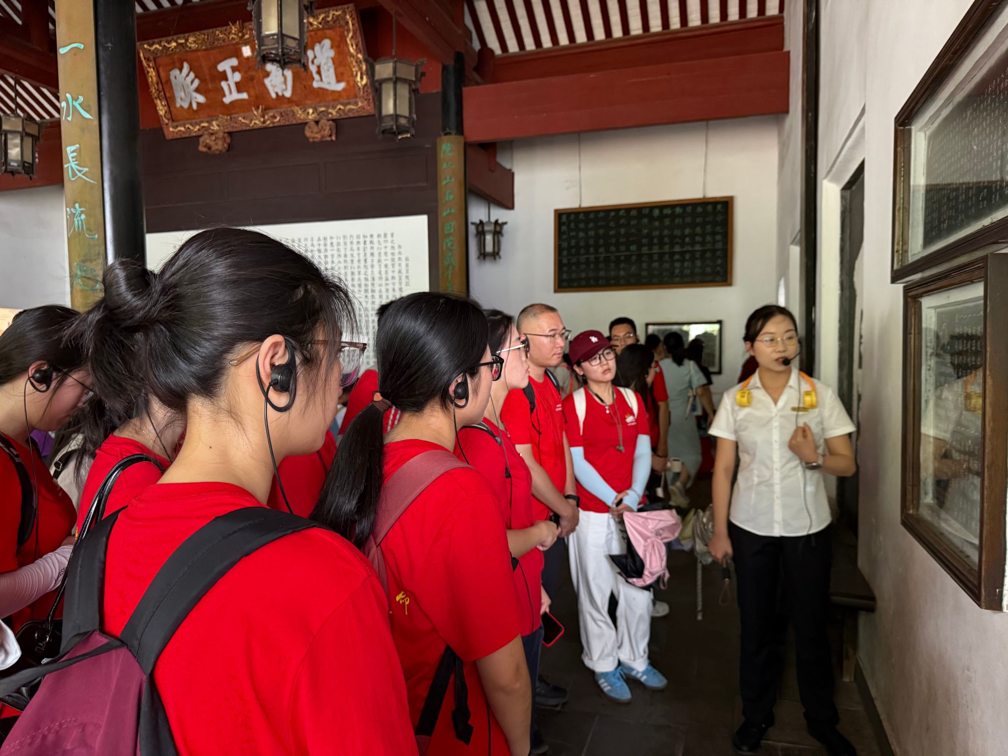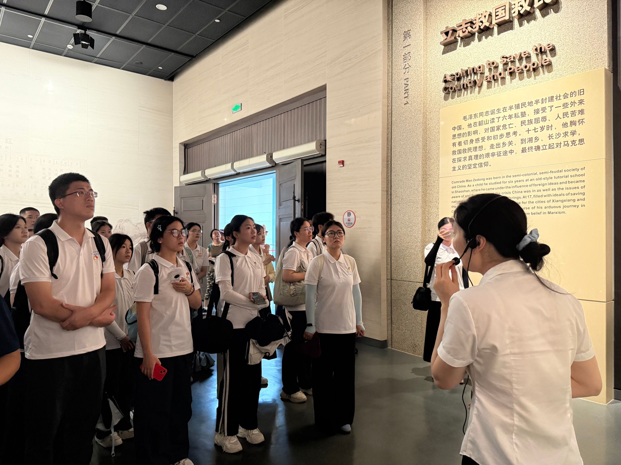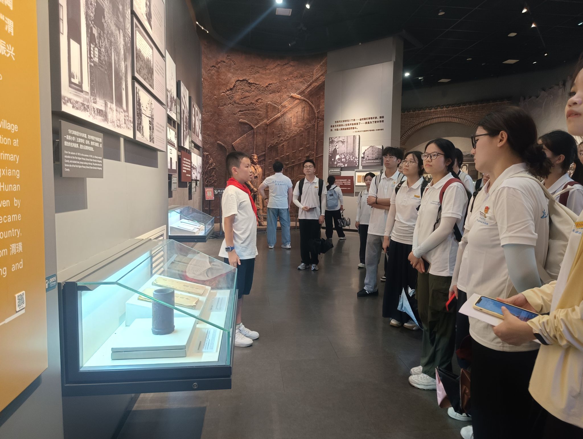 实践队探访岳麓书院和湖南第一师范学院,深刻领悟习近平总书记关于“教育是国之大计、党之大计”的重大意义,在底蕴深厚的中华文明中探寻推动教育科技人才良性循环的历史印记,了解到湖湘大地的先人们究天人之际、格物穷理的崇尚科学、经世致用的优良传统,写就了“一部近代史,半部湖南人”的壮美传说。李颖诺同学在研学中表示,“岳麓学院、城南书院、湖南第一师范学校以重视学生全面发展、育天下英才为己任,培养了一大批救国救民的仁人志士,影响推动了中国近现代历史进程。”在湖南一师旧址,实践队追寻青年毛泽东“身无分文,心忧天下”的求学足迹,感悟到早期的湖南一师就以“修养教育家之精神”为目标,为党和国家培养诸多栋梁。正是在一师受教育的革命先烈推动中华民族站了起来,以青春之躯肩负起中华民族伟大复兴的重要使命。“双带头人”教师党支部书记姚禹博士在参观后表示,“在这里我学习了湖南一师‘教育救国’的历史,看到中华民族历来注重‘育才造士’,信奉‘国有贤良之士众,则国家之治厚’的传统文化。以史为鉴,我们要为加快建设世界重要人才中心和创新高地,实现教育强国建设目标而不懈奋斗”。