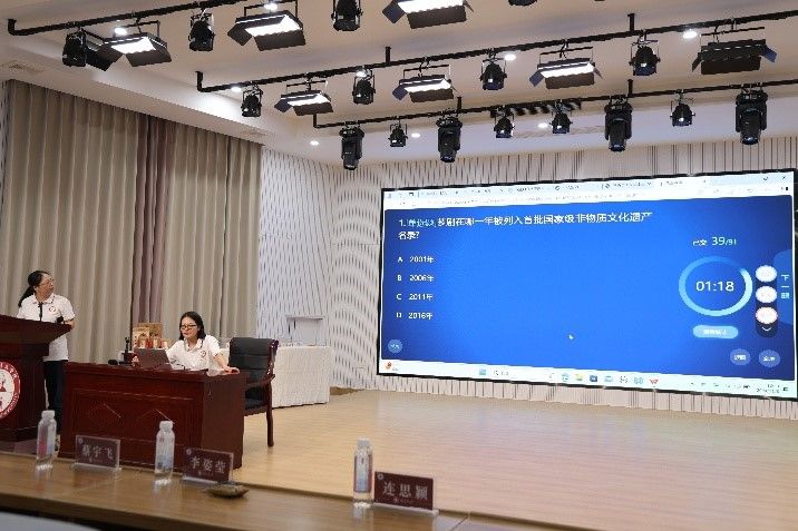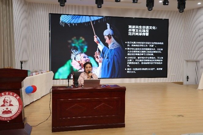 活动过程中李姿莹老师首先为在座的同学们讲述了台湾歌仔戏发展的历史,使同学们认识到这不仅是一部地方戏曲艺术的演变史,更是一段两岸文化交流的历史。随后,李姿莹老师与连思颖同学通过师生同台表演、现场体验等方式,使同学们近距离感受到了芗剧独特的身段韵律、细腻的表演手法以及优美的唱腔唱段,点燃了在座同学对芗剧乃至中华优秀传统文化的热情。漳州市戏剧研究所蔡宇飞所长结合自身芗剧剧本创作的经历阐述了芗剧在青年学生中传承的意义及未来展望。