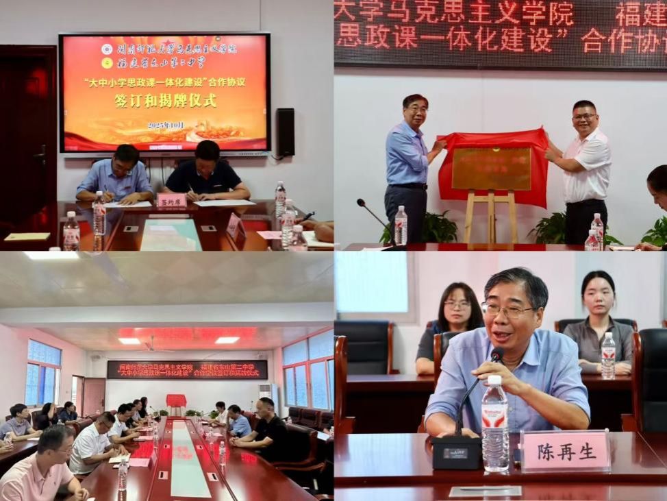 10月31日下午,我院院长陈再生一行与东山县教育局党委副书记、副局长黄小胖,东山二中校长孙为民、党总支书记刘荣宗及全体政治学科教师于东山二中厚德楼五楼会议室隆重举行“大中小学思政课一体化建设”合作协议签约暨共建基地揭牌仪式。(通讯员 沈书伊)