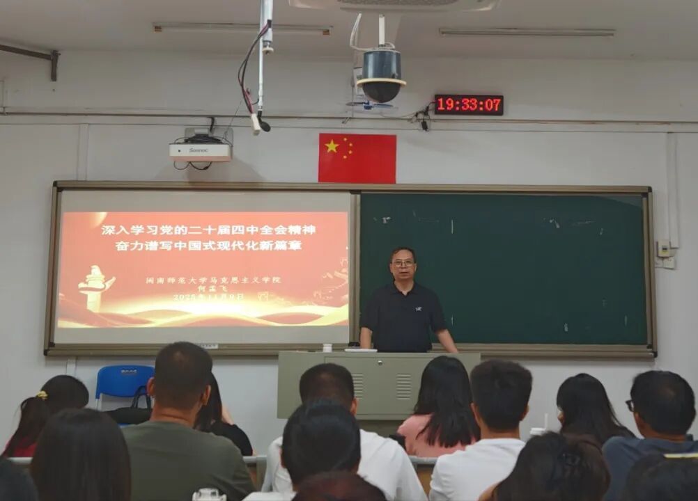 近日,我院马克思主义理论读书社等五个读书社于综合楼南区203举办“学习贯彻党的二十届四中全会精神”专题分享会。本分享会邀请何孟飞教授为同学们作了《深入学习党的二十届四中全会精神奋力谱写中国式现代化新篇章》专题报告。(通讯员 林诗颖)