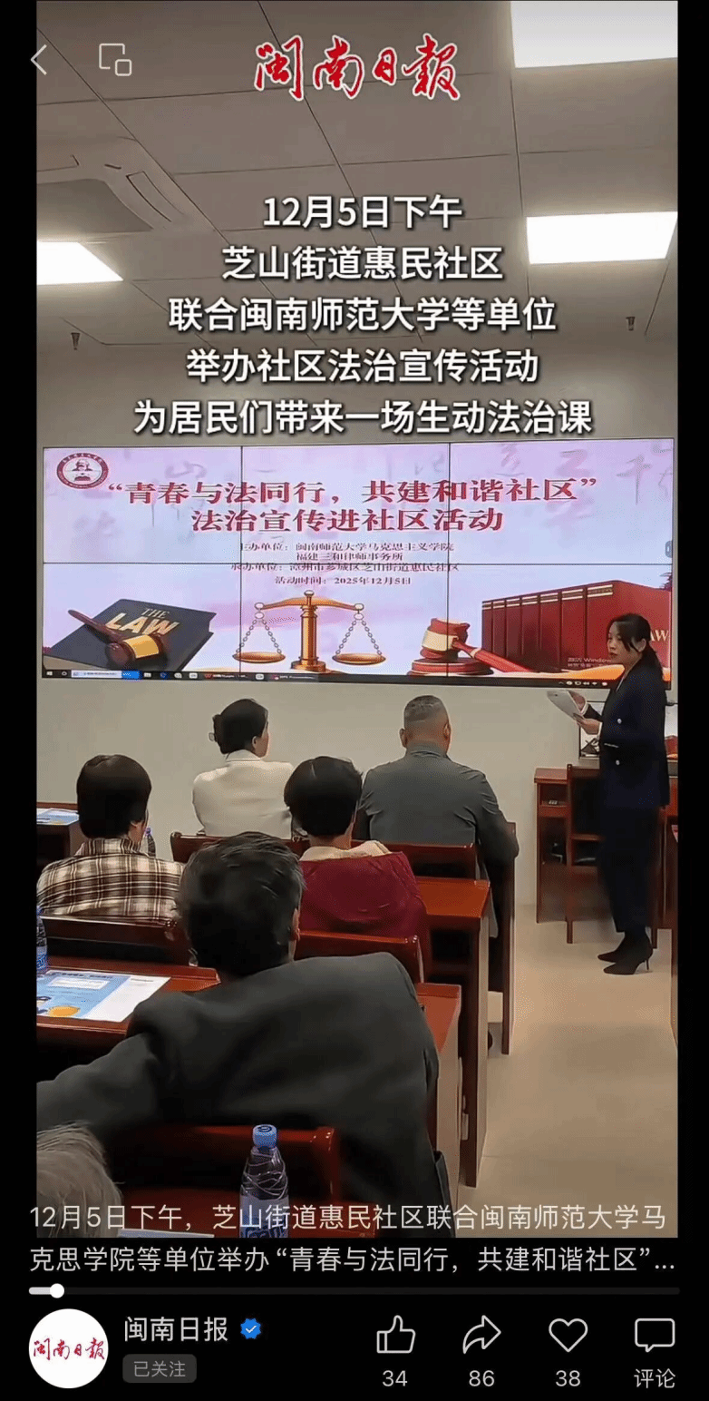12月5日下午,我院联合福建三和律师事务所、漳州市芗城区芝山街道惠民社区开展“青春与法同行,共建和谐社区”法治宣传进社区活动。漳州市芗城区芝山街道惠民社区经济服务中心主任林惠斌,惠民社区书记吴阿梅,福建三和律师事务所程海、林得胜、柳彩云、陈晓宇律师,我院副院长林海燕、团委书记潘怀杰、辅导员沈书伊参加本次活动,活动由我院2025级硕士研究生谢诗瑶主持。(通讯员 沈书伊)
