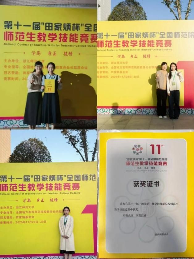近日,我院组织“三人行”师生成长工作室教师团队于浙江师范大学指导第十一届“田家炳杯”全国师范院校师范生教学技能竞赛,我院2023级思政一班白欣琳同学荣获全国二等奖。(通讯员 邓湘)