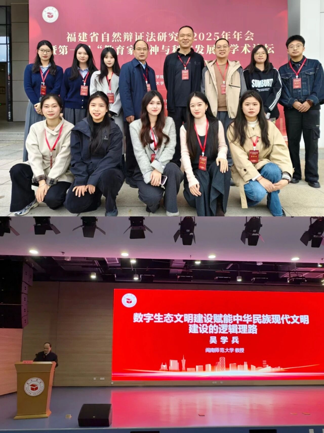 12月12日至14日,我院吴学兵教授、江晓晖副教授、院团委书记潘怀杰及10名硕士研究生赴莆田学院参加福建省自然辩证法研究会2025年年会暨第一届“教育家精神与科技发展”学术论坛。会上,吴学兵教授作《数字生态文明建设赋能中华民族现代文明建设的逻辑理路》主题发言,并获评一等奖。(通讯员 陈凡凡)