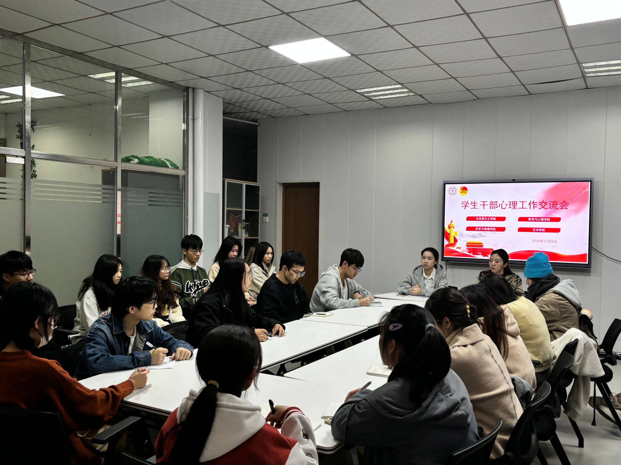 12月8日下午,我院自律会心理协会与艺术学院、教育与心理学院、历史地理学院心理组织于瑞京社区太阳集团站合办学生干部心理工作交流会,我院心理辅导站站长沈书伊、教育与心理学院心理辅导站站长陈燕云出席本次交流会。(通讯员 赖晨希)
