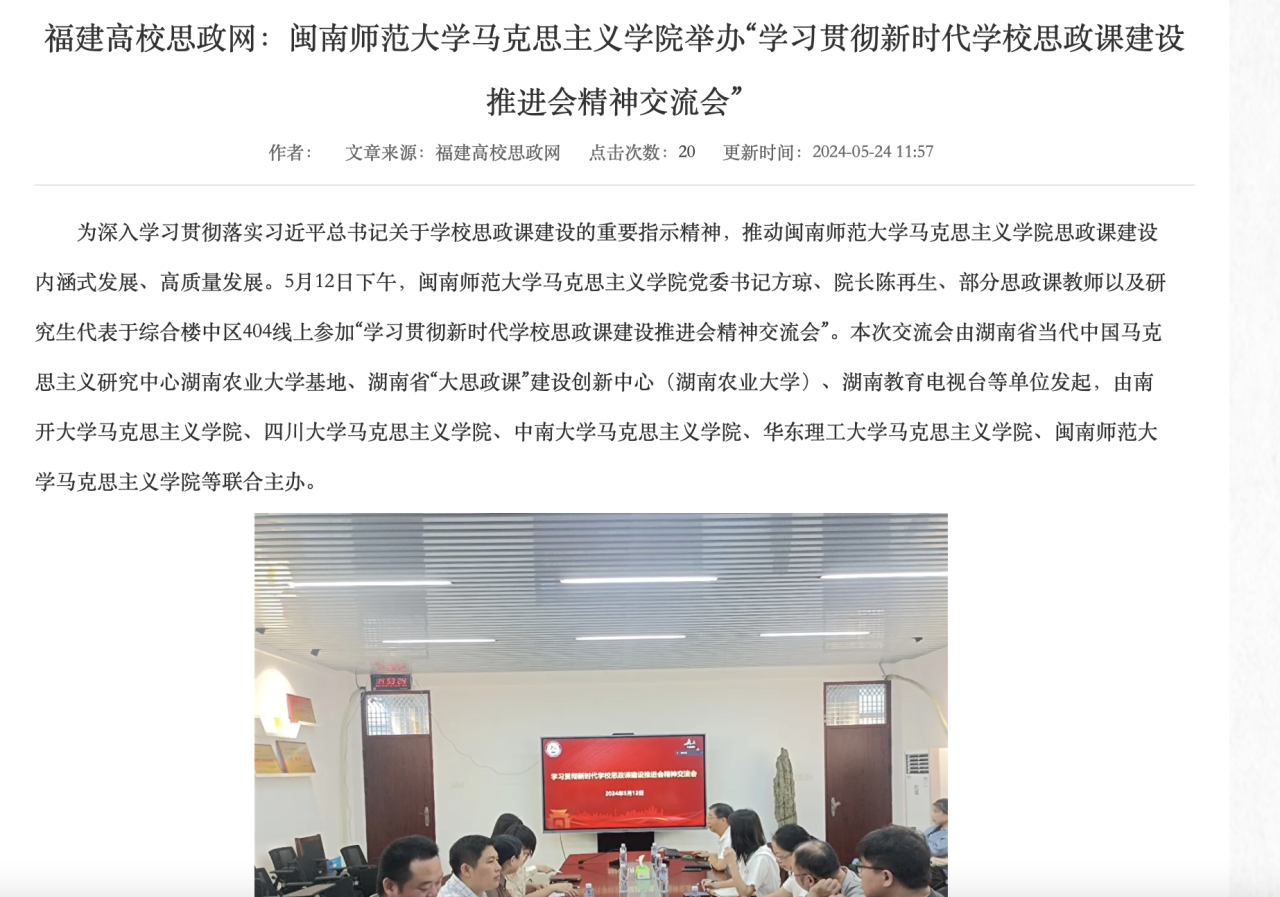 5月24日,由我院举办的“学习贯彻新时代学校思政课建设推进会精神交流会”受到福建高校思政网平台的专题报道。(通讯员 林晨)