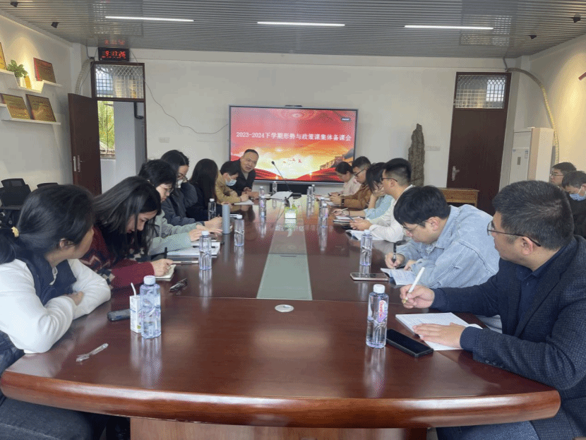 3月21日上午,我院在综合楼中区404召开2023-2024下学期形势与政策课集体备课会,我校二级学院形势与政策课工作联络员参加会议。(通讯员 王思涵)