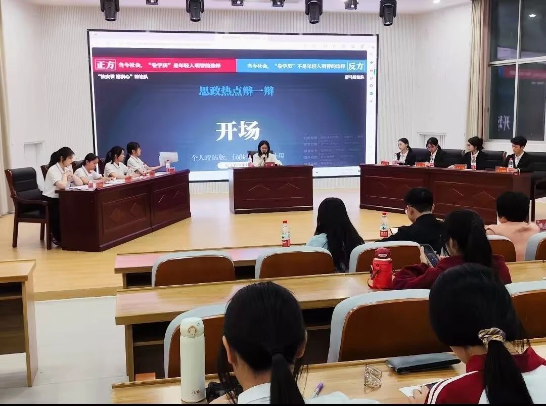 11月23日,我院辩论队携手法学院辩论队于校东门梯教马院礼堂举办主题为“当今社会,卷学历是/不是年轻人明智的选择”的“思政热点辩一辩”辩论邀请赛。(通讯员 任程龙)