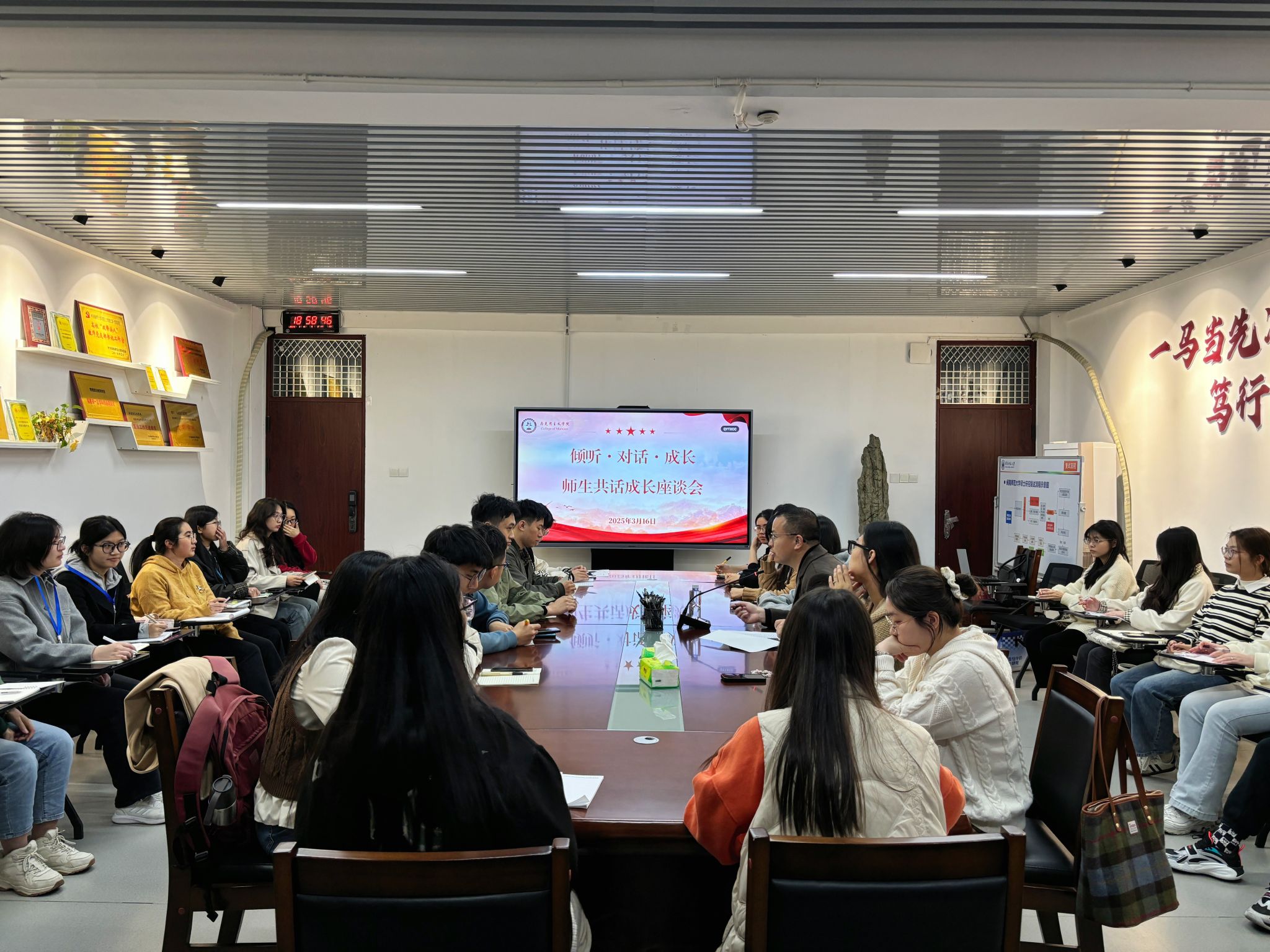 3月16日晚上,我院于综中404召开“倾听·对话·成长”——师生共话成长座谈会。本次会议由我院党委副书记邓战军主持,学院各学生组织负责人、各班班委代表共同参与。(通讯员 张小敏)